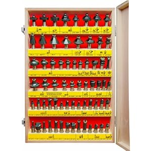 Product Description : From the ManufacturerThe largest, most inclusive carbide tipped router bit set we've ever offered at an amazingly low price. The 66 high quality router bits in this new set will handle a vast number of project applications. You'll always have the right bit on hand. Set includes: 8 Straight Bits (1/4, 5/16, 3/8, 7/16, 1/2, 5/8, 3/4 and 1-inch), 5 Dovetail Bits (7.5 deg-1/4-inch, 9 deg-3/8,14 deg-1/2, 5/8, 3/4), 3 Core Box Bits (1/4, 3/8, 1/2), 3 Round Nose Bits (1/4, 3/8, 1/2), 2 Flush Trim Bits (3/8, 1/2), 3 Hinge Mortising Bits, (1/2, 5/8, 3/4), 1 Panel Pilot Bit (3/8), 1 Bevel Trim Bit (25 deg), 1 Bevel Bit (30 deg), 3 V-Groove Bits (3/8, 1/2, 5/8), 6 Round Over Bits (1/8, 3/16, 1/4, 5/16, 3/8, 1/2), 2 Roman Ogee Bits (1/4, 5/32), 6 Cove Bits (1/8, 3/16, 1/4, 5/16, 3/8, 1/2), 1 Groove Forming Classical Bit (3/4), 1 Double Cove and Bead Bit, 1 Point Cutting Round Over Bit (1/2), 1 Ogee Fillet Bit (1-3/8), 1 Flat Bottom Round Over Bit (1/4), 1 Cove and Bead Bit (5/16), 2 Edge Beading Bits (1/4, 3/8), 1 Multi Bead/Reed Bit (1/8), 1 Dish Cutter Bit (1), 1 Keyhole Bit (3/8), 1 Classical Bit (3/16), 1 Double Round Over Bit (5/32), 1 Flat Bottom Sign Lettering Bit (5/8-inch 60 deg), 1 Cove Sign Lettering Bit (5/8-inch 60 deg), 2 Slot Cutter Bits (1/4, 3/8), 1 Rabbeting Bit (3/8), 4 Chamfer Bits (30 deg, 22.5 deg, 15 deg, 45 deg), plus 3 bearings and allen wrench. All Bits 1/2-inch shank.