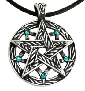Pewter Pentagram Pagan Pendant w/5 Swarovski Crystal Blue Topaz December Birthstones, Leather Necklace